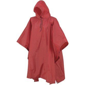 Complete weather and rain protection. Waterproof, rip-stop nylon fabric. Features an elongated hood with tie closure. Grommeted corners for emergency shelter or tarp. Two snaps on each side for added protection. Comes with a reusable mesh storage/carry bag. Size: Large, 84" x 52". Red only.